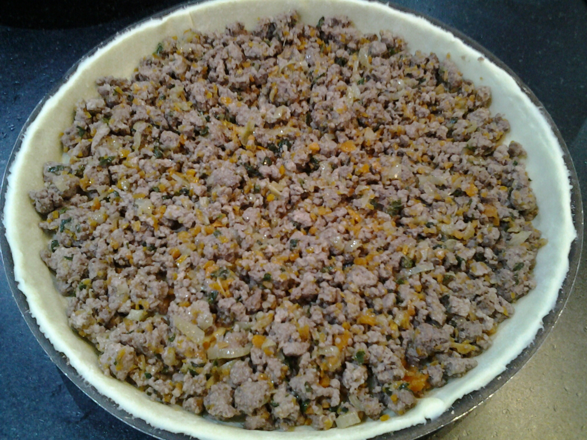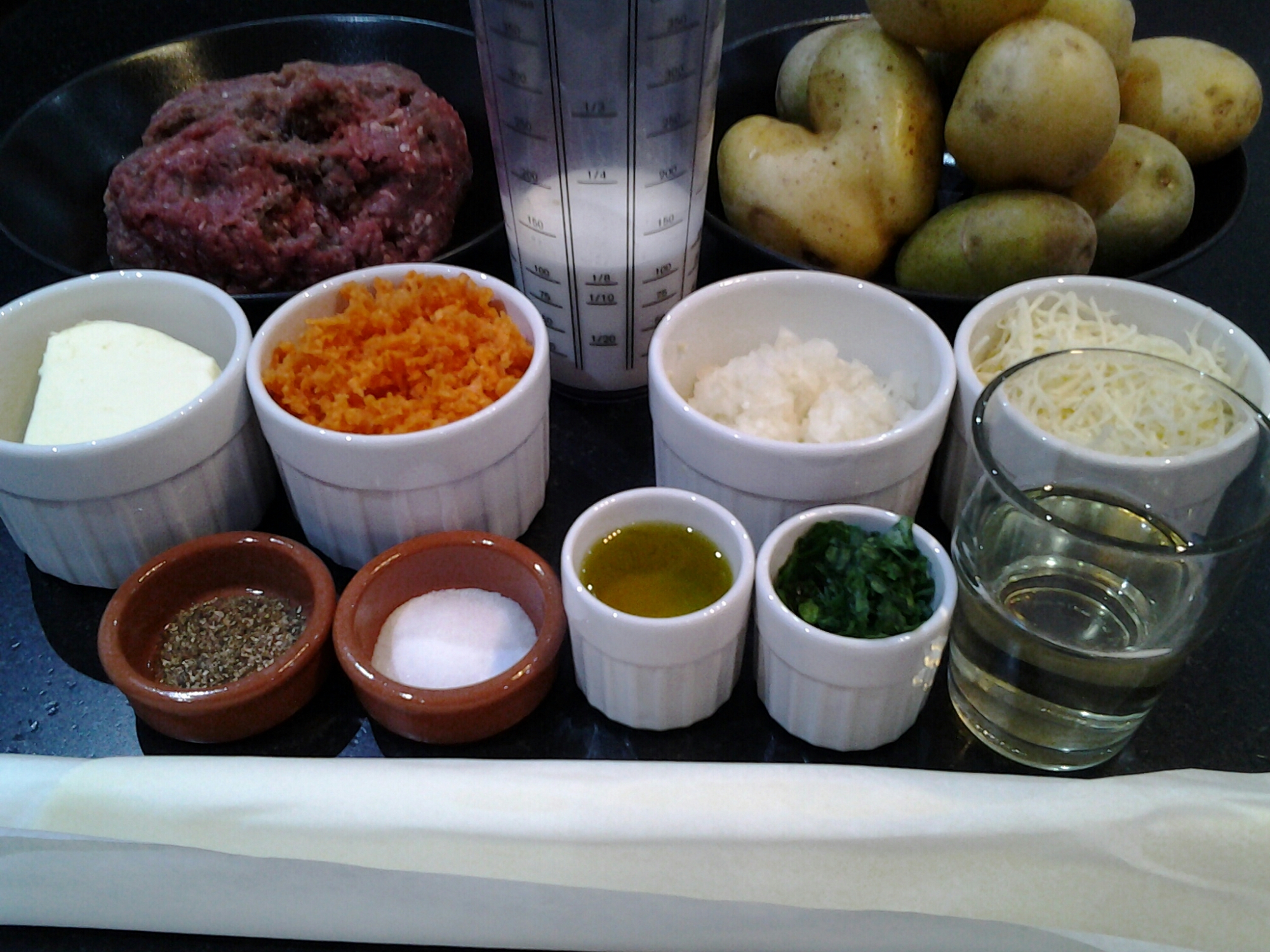500 g de viande hachée pur bœuf, 1,200 kg de pommes de terre, 100 g de beurre, 80 g de gruyère, 1 pâte feuilletée à dérouler, 2 carottes hachées, 1 oignon haché, 25 cl de crème fraîche liquide, 10 cl de vin blanc, 3 cl d’huile d’olive, 2 cuil à soupe de persil haché, 5 pincées de sel, 2 pincées de poivre.