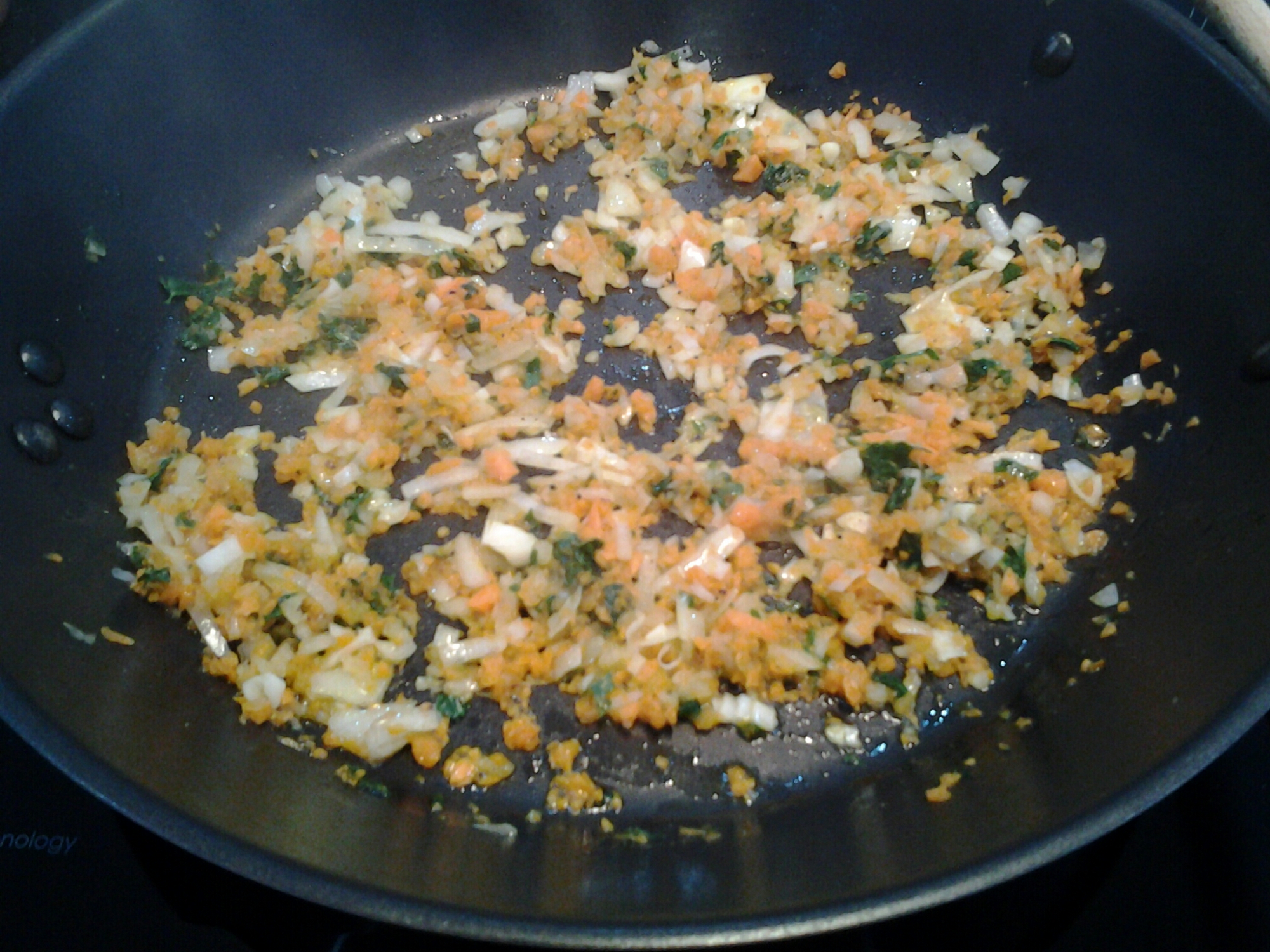 Faire chauffer une poêle, verser l’huile d’olive, l’oignon, les carottes, le persil, saler et poivrer et faire suer 2 à 3 minutes .