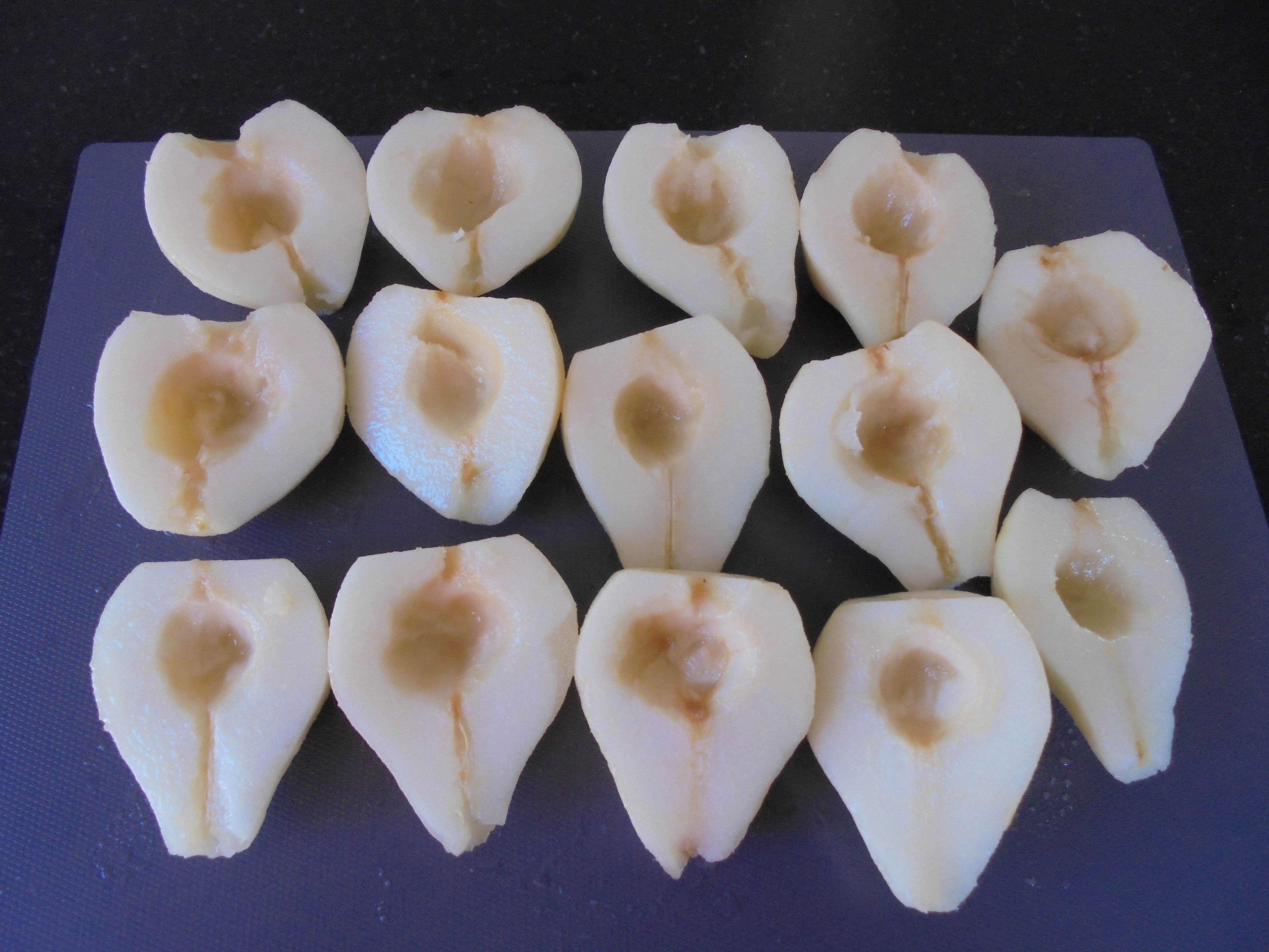 Eplucher les poires, les couper en 2 puis enlever les pépins et les 2 extrémités de la poire.