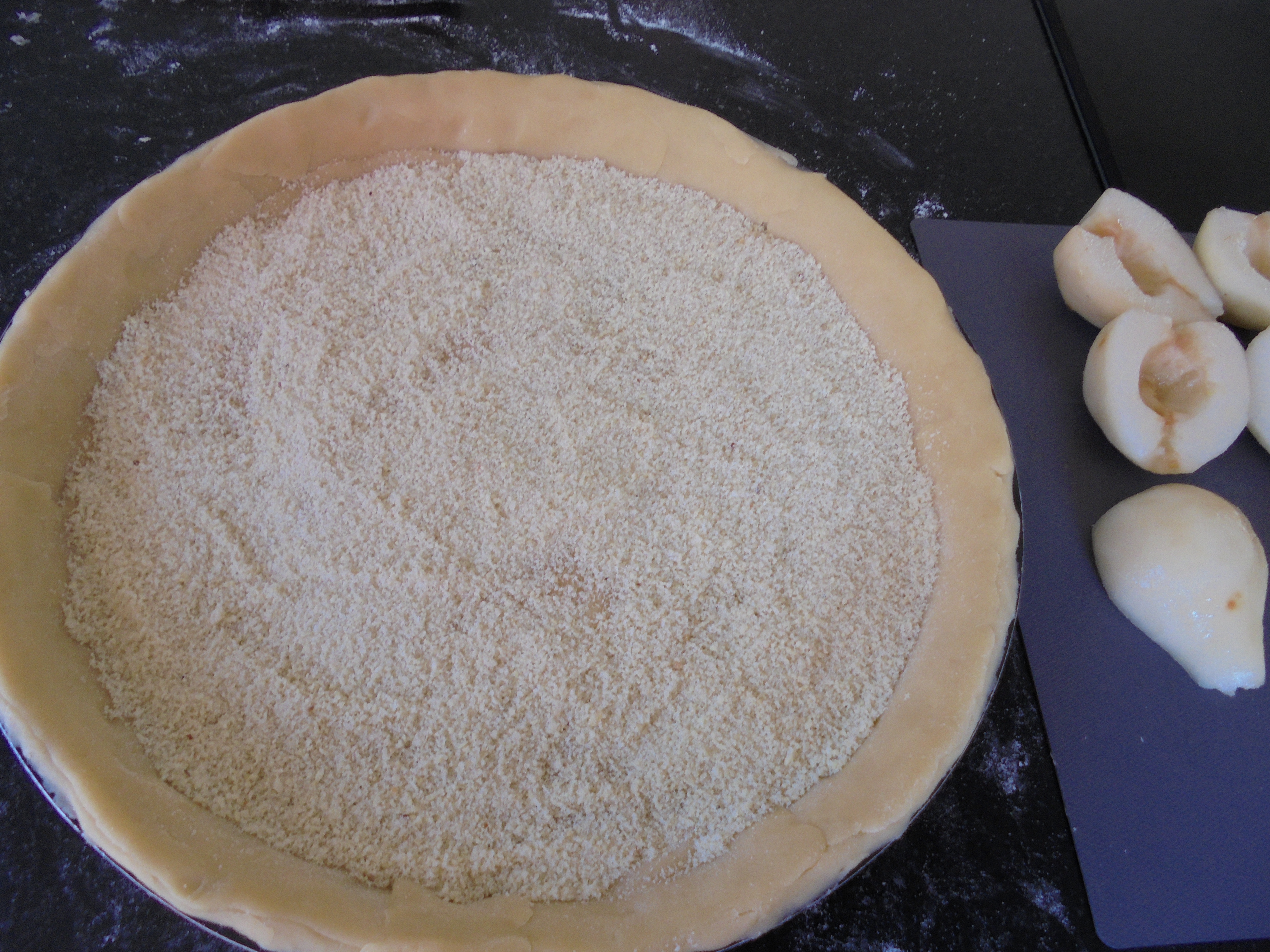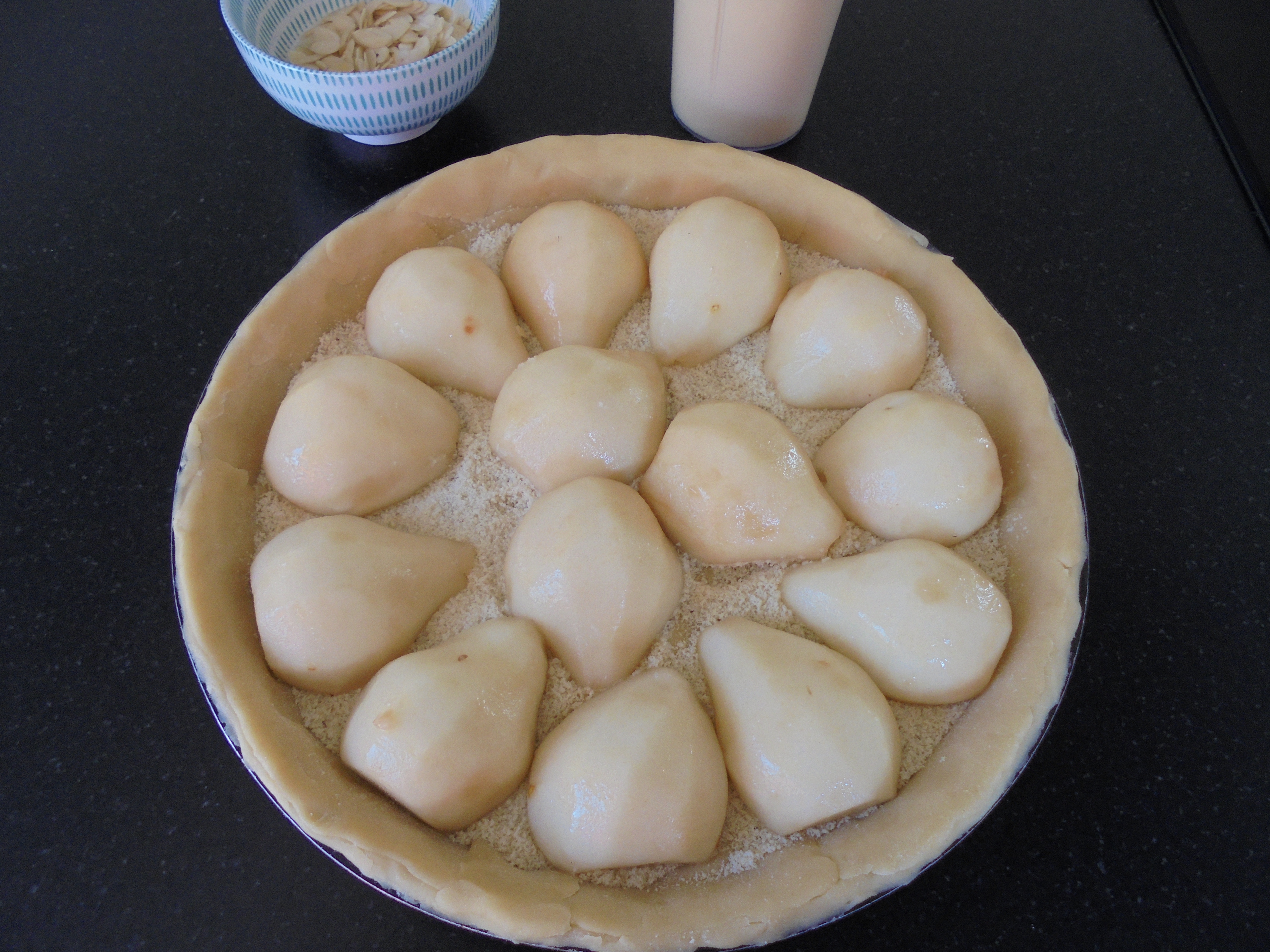 Préchauffer votre four à 200°C. Etaler la pâte salée à l’aide d’un rouleau à pâtisserie, puis disposer-la dans un moule à tartes. Ensuite, verser la poudre d’amandes dans le fond de tarte. Bien répartir puis disposer les poires par-dessus. Verser le contenu du shaker par-dessus. Enfourner pendant 25 minutes à 200°C, puis verser les amandes effilées par-dessus et ré-enfourner pendant 15 à 20 minutes.