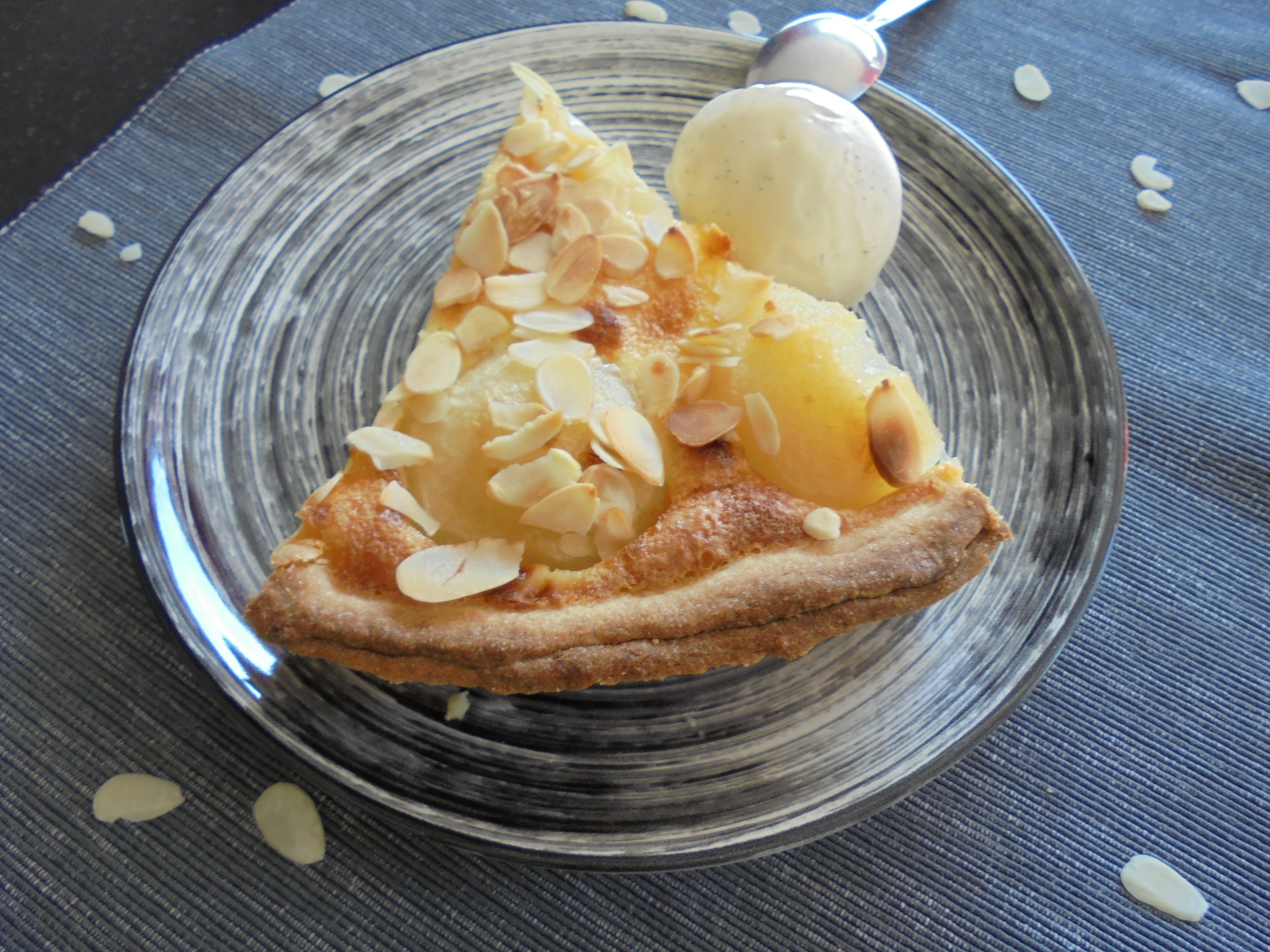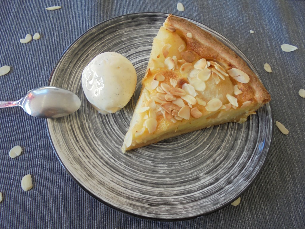 6 à 7 poires de Rocha (de préférence), 100 gr de poudre d’amandes, 2 sachets de sucre vanillé, 100 gr de sucre semoule, 25cl de crème fraîche liquide 30% de mg, 3 œufs, 30 d’amandes effilées.