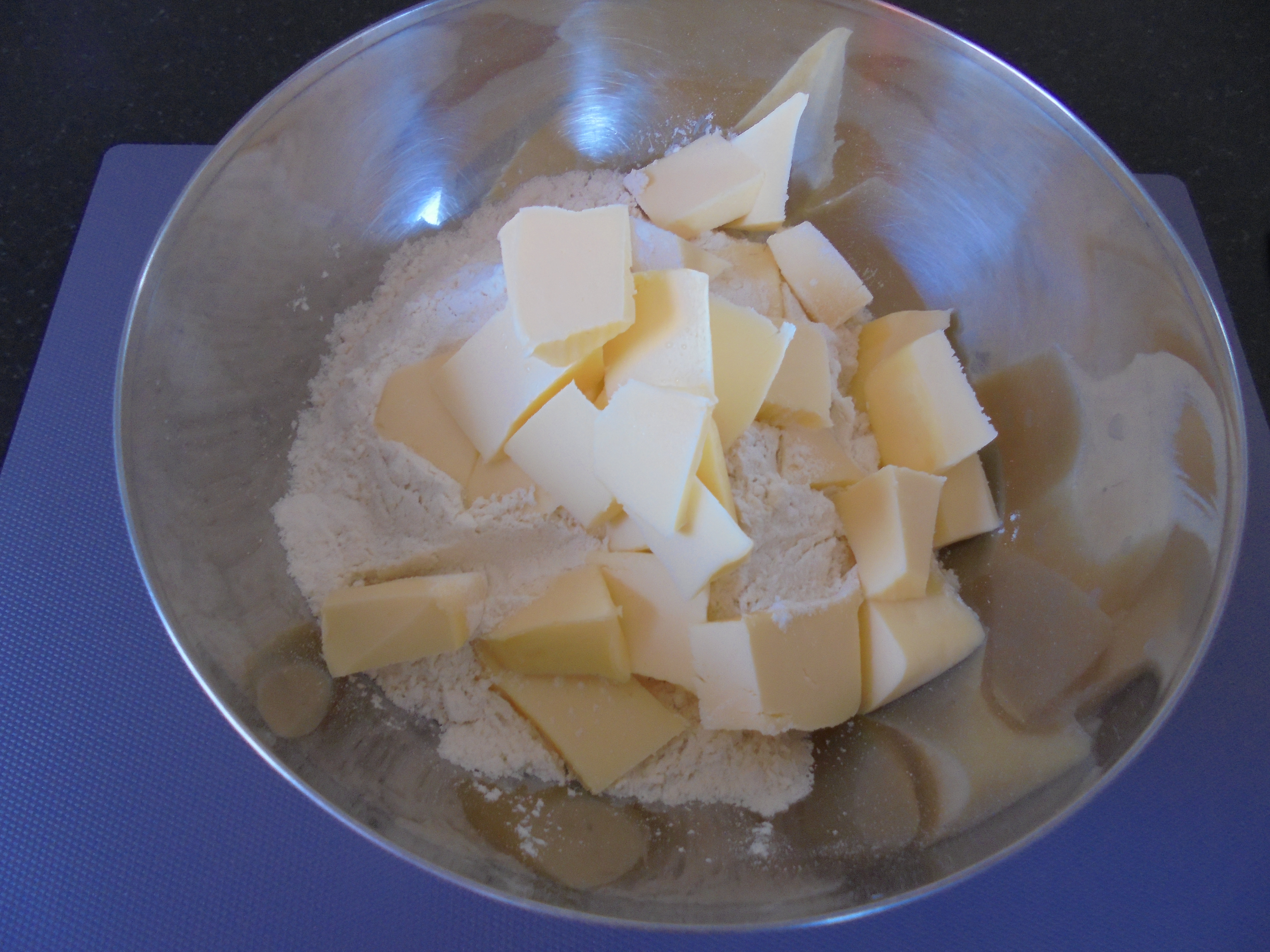 Dans un saladier verser la farine, le beurre coupé en petit bouts, puis mélanger le tout jusqu’à ce que le beurre soit mélangé à la farine.
