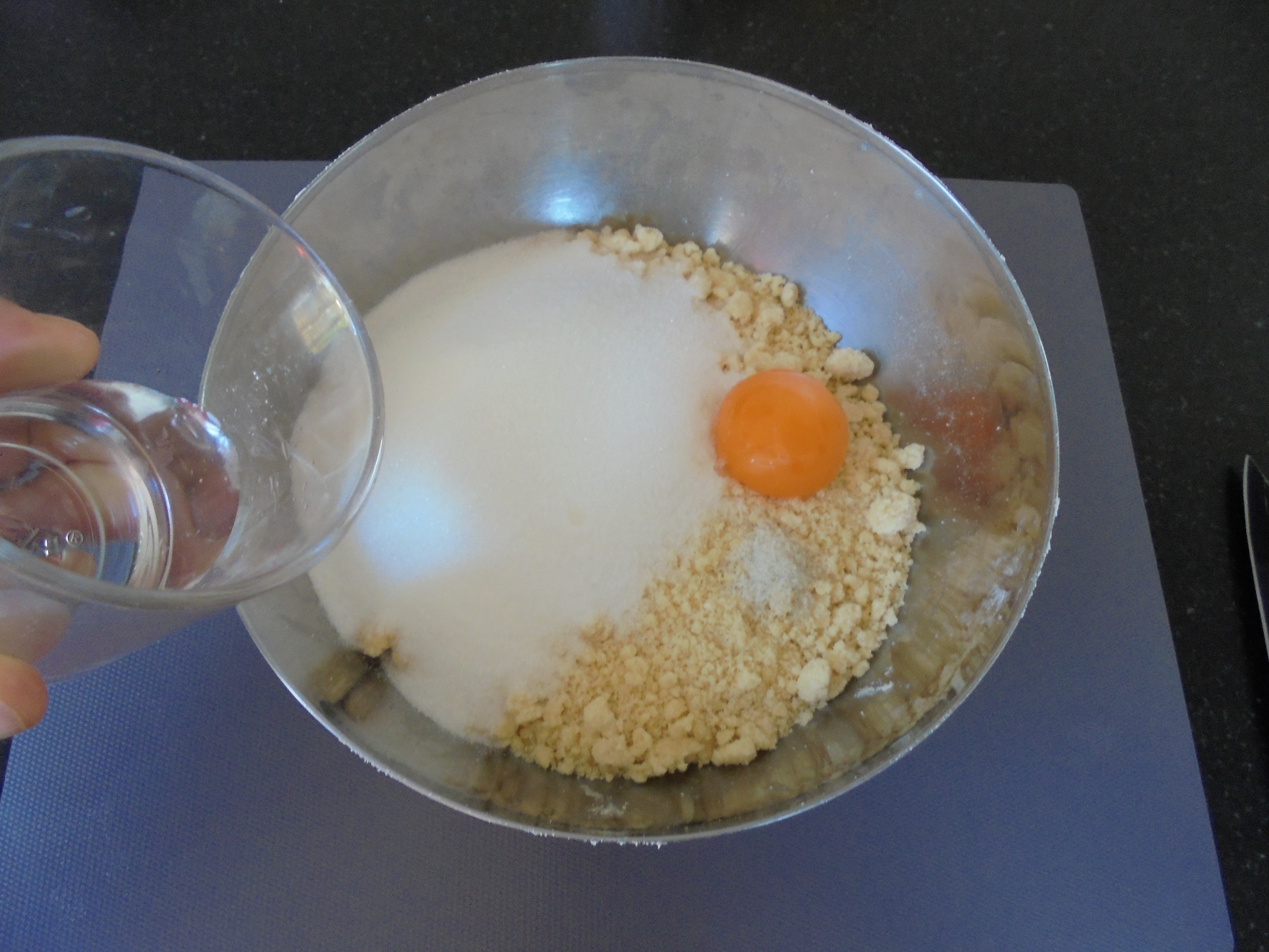 Verser ensuite le sucre, le jaune d’œuf, le sel et l’eau.